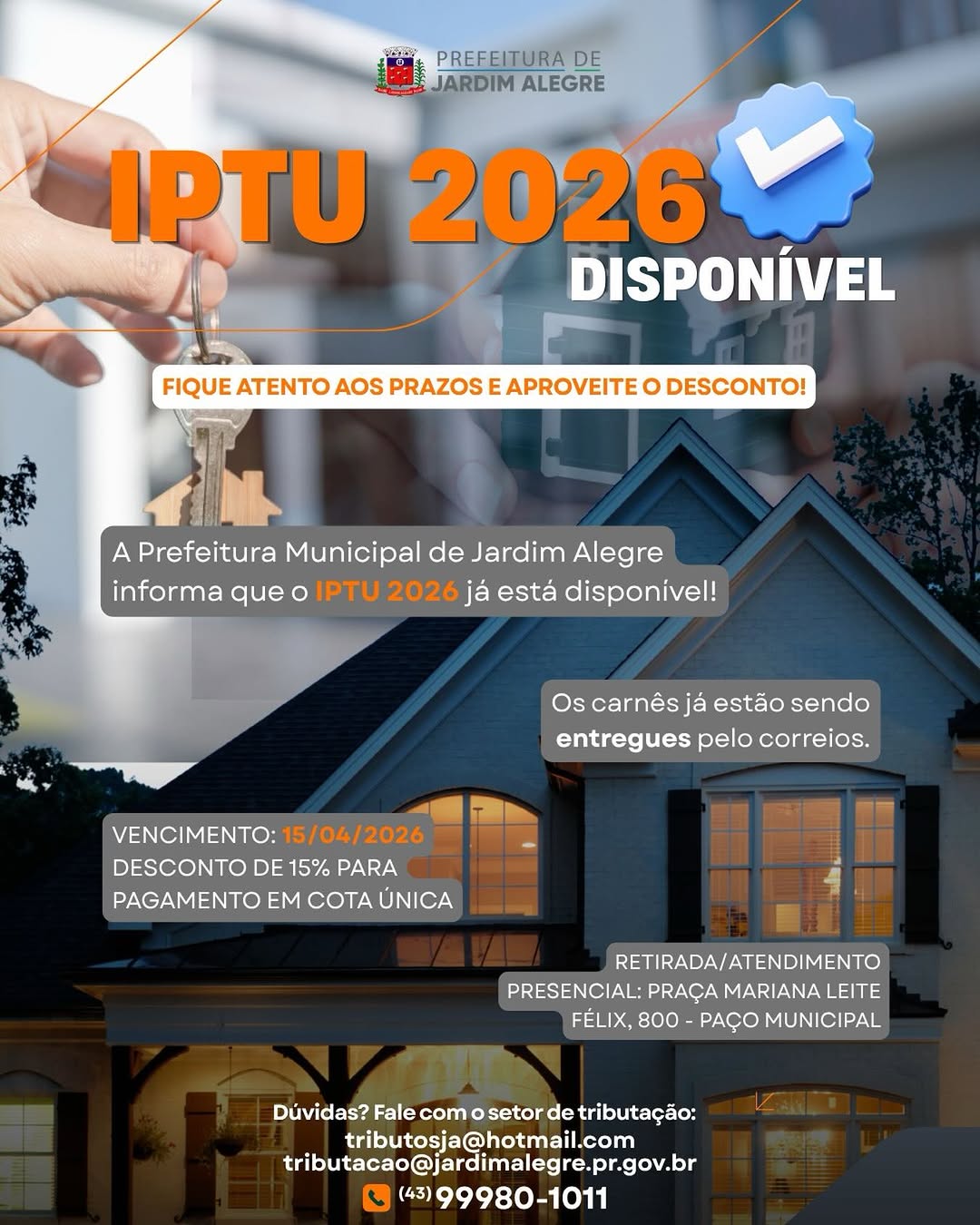 Foram instalados 4 pontos da rede Wi-Fi Pública na Cidade de Jardim Alegre, na Praça da Igreja Matriz, Rotatória do Monumento da cidade, Praça em frente ao Colégio Cristóvão Colombo e no Lago Municipal Angelo Santini.