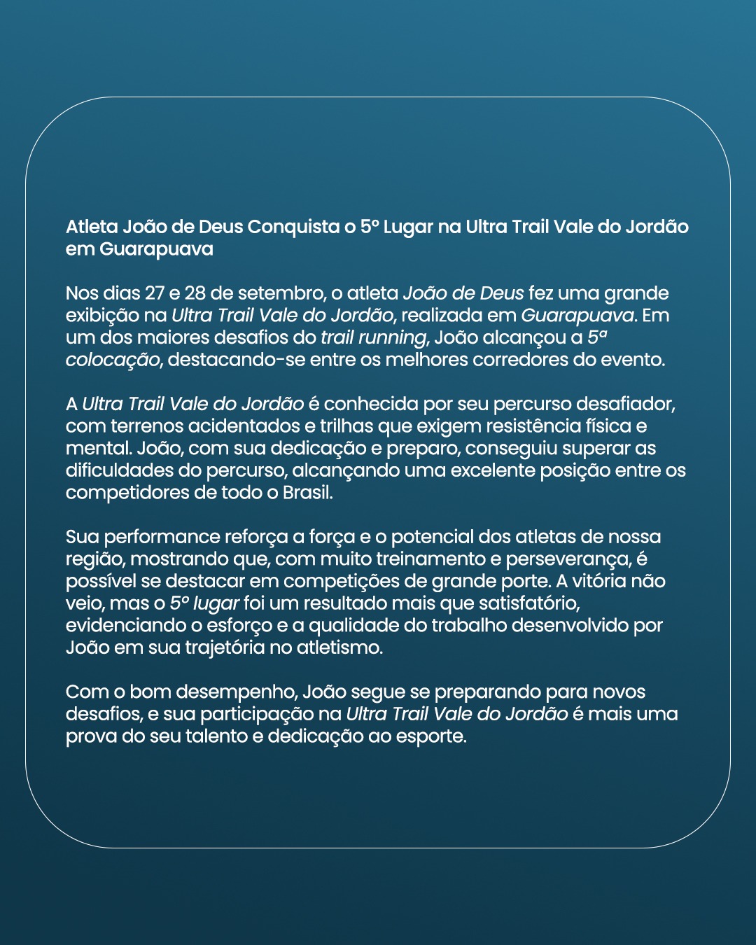 Nos dias 27 e 28 de setembro, o atleta João de Deus, representando Jardim Alegre, conquistou o 5º lugar na Ultra Trail Vale do Jordão, em Guarapuava.