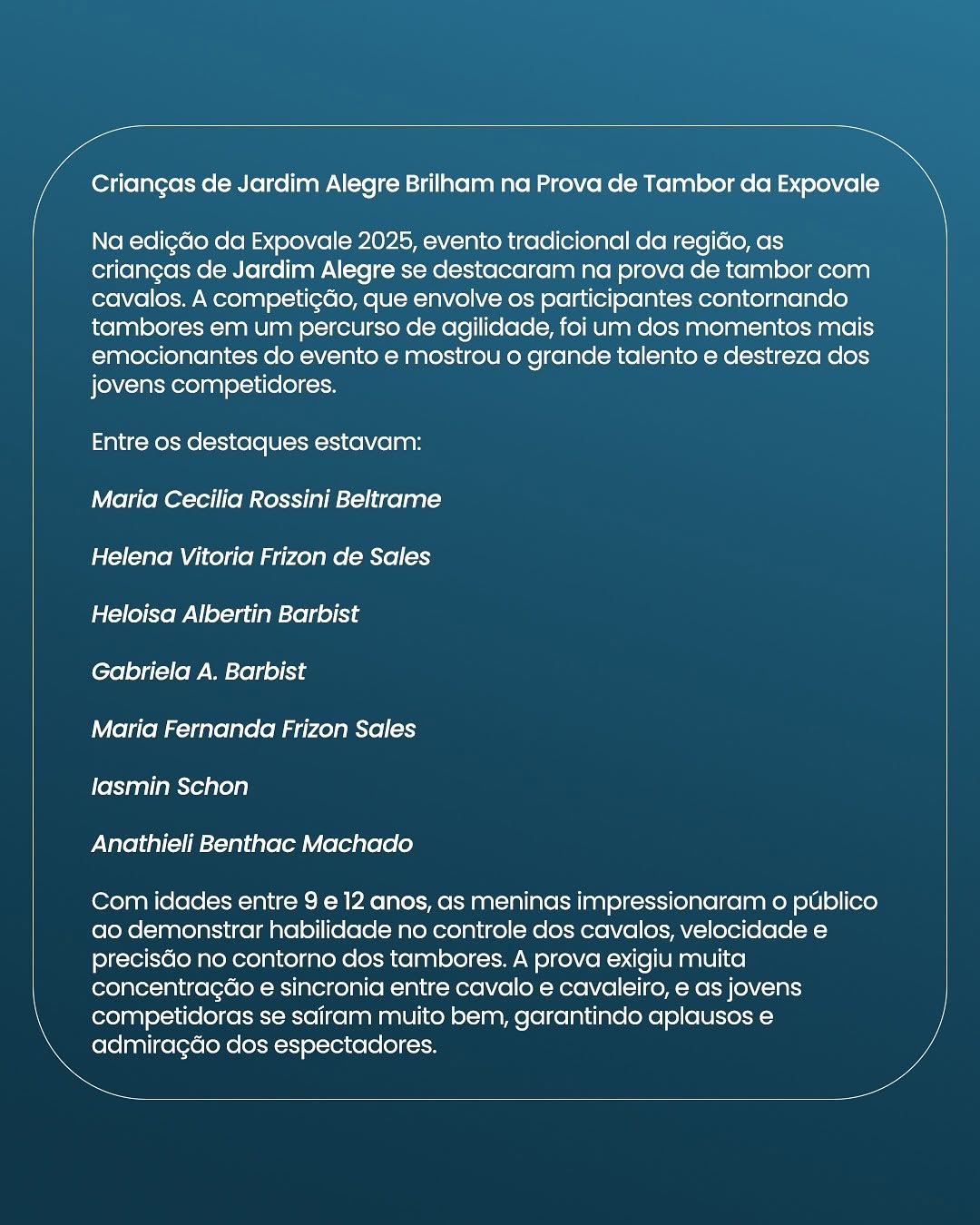 No último fim de semana, nossos jovens cavaleiros mostraram toda a sua habilidade e coragem na tradicional Prova de Tambor durante a Expovale 2025! Com muita destreza e precisão, as crianças de nossa cidade encantaram o público, provando que o talento e a paixão pelo esporte estão mais vivos do que nunca em Jardim Alegre.