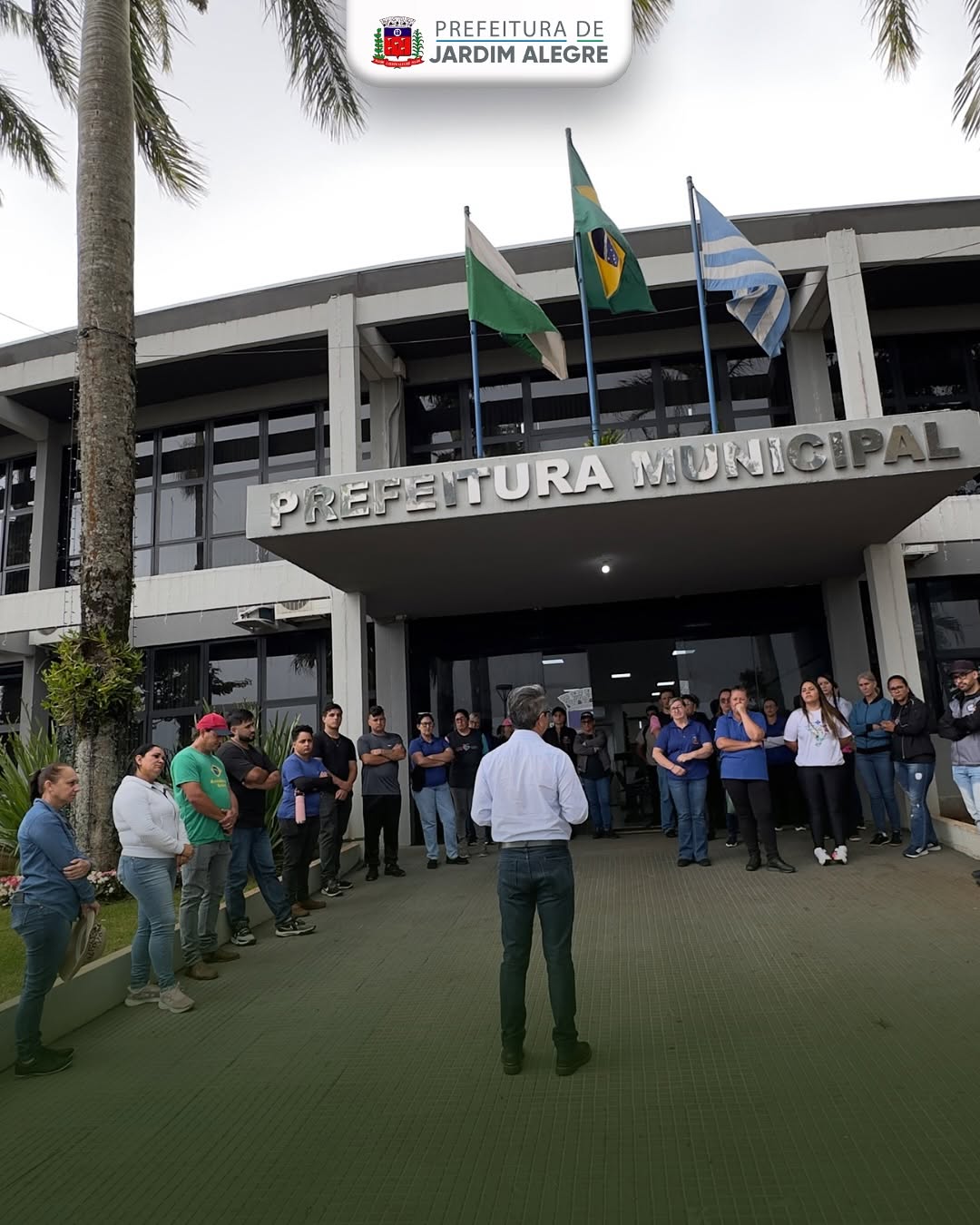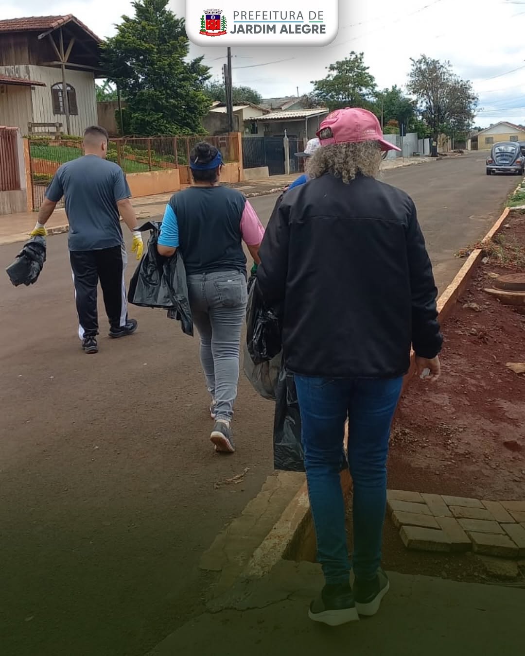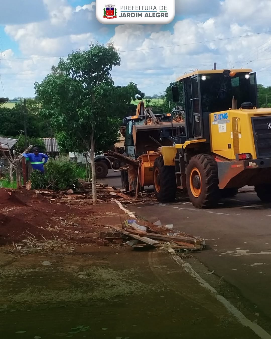 A Prefeitura de Jardim Alegre deu início à grande ação de limpeza em toda a cidade. Pela manhã, as equipes se reuniram em frente à Prefeitura para o alinhamento das atividades, e ao longo do dia máquinas pesadas, caminhões e servidores estiveram nas ruas realizando coletas e organizando os materiais descartados.