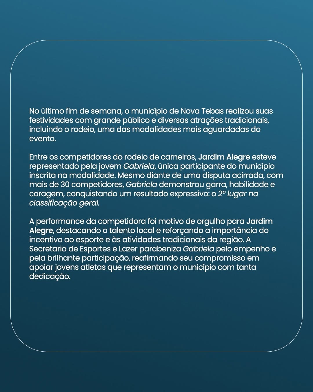 A Secretaria Municipal de Esportes e Lazer parabeniza Gabriela pelo desempenho e pela dedicação.