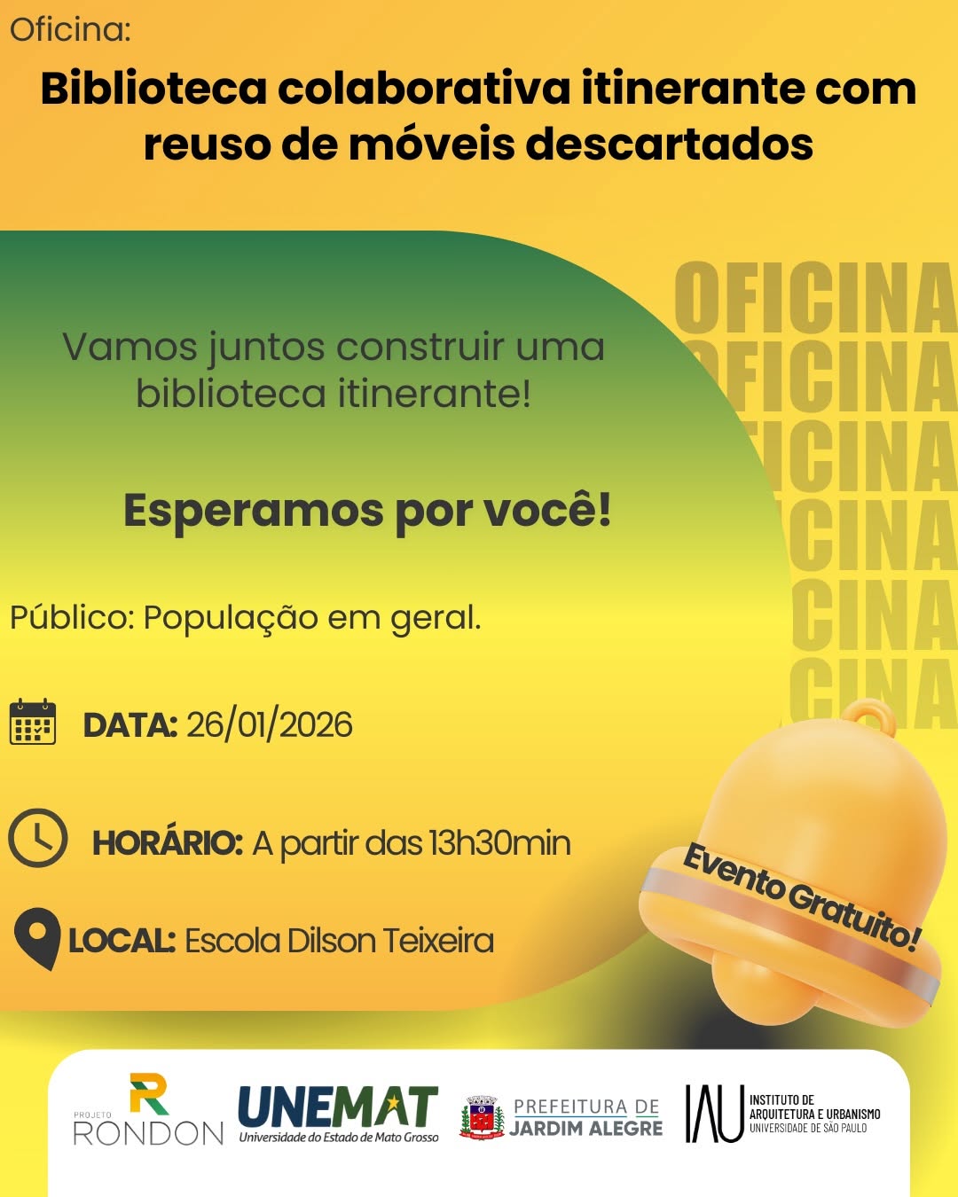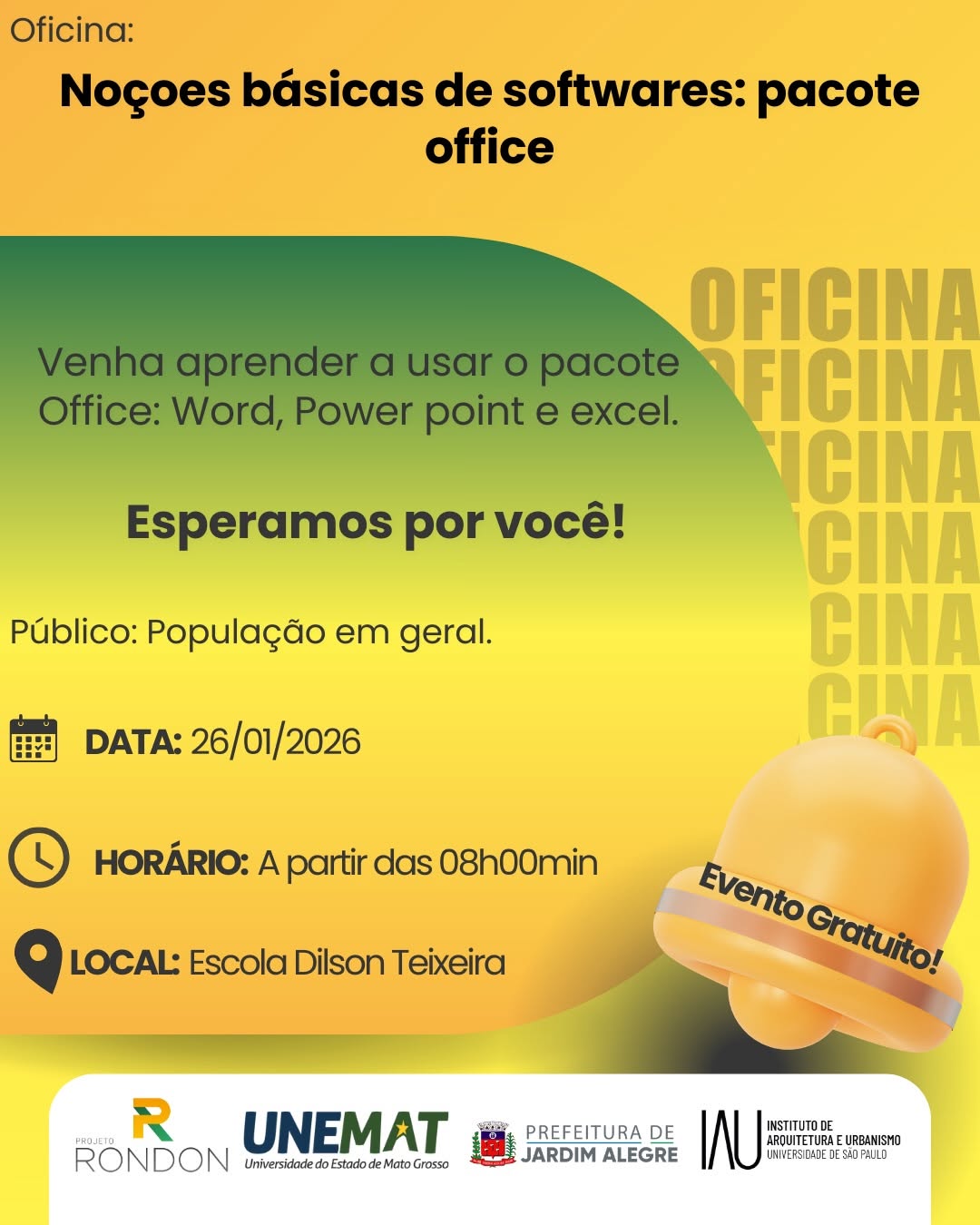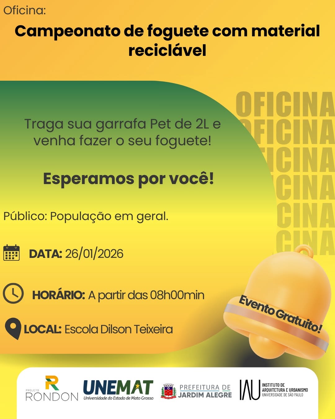 Na segunda-feira (26/01/2026), o município recebe uma programação especial de oficinas gratuitas do Projeto Rondon, com ações voltadas à educação, saúde, cidadania, inovação e fortalecimento comunitário.