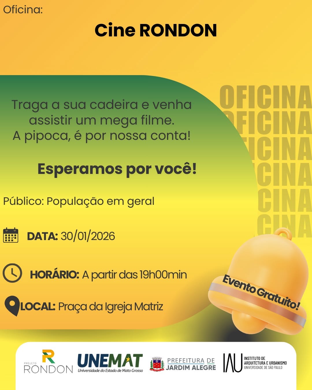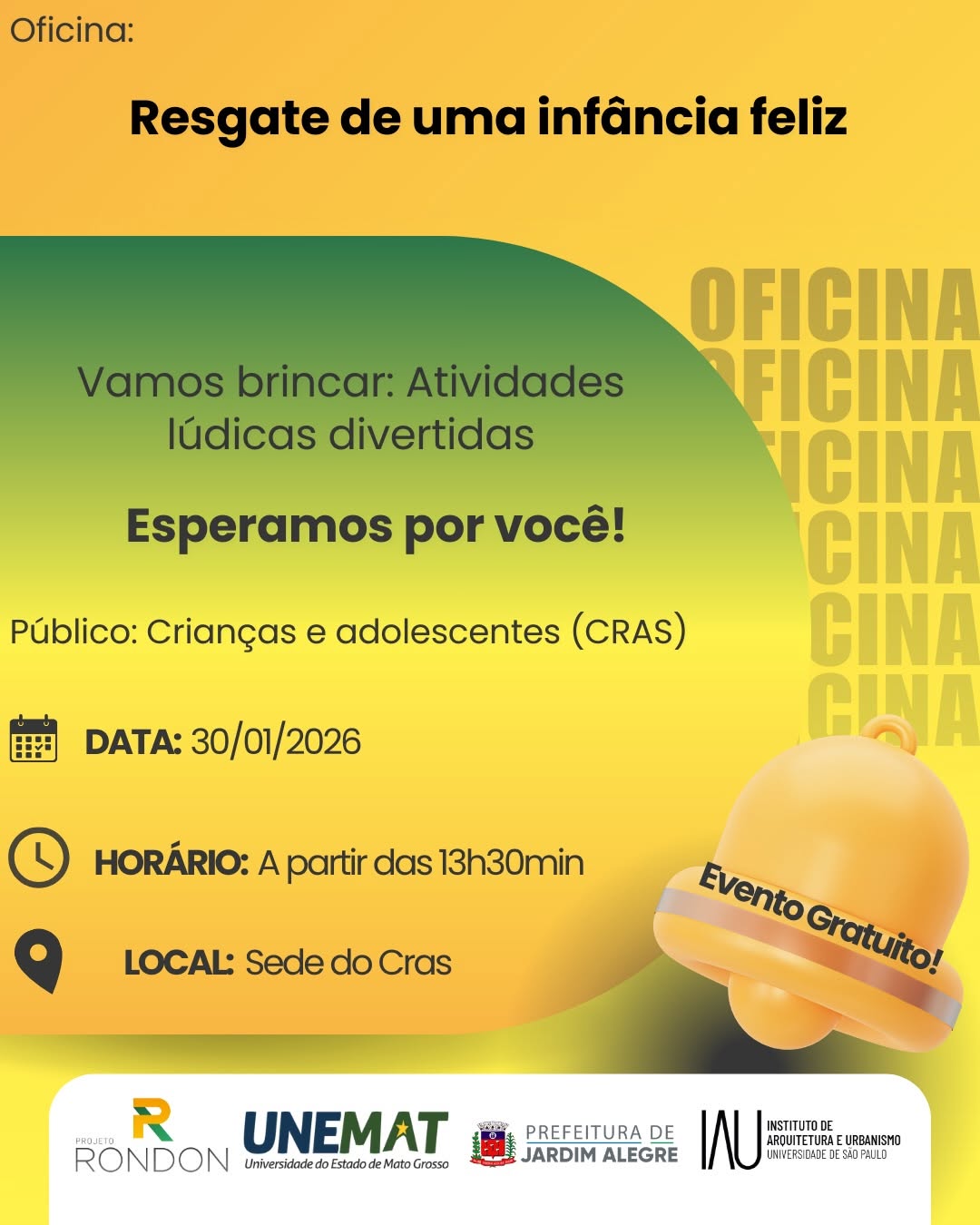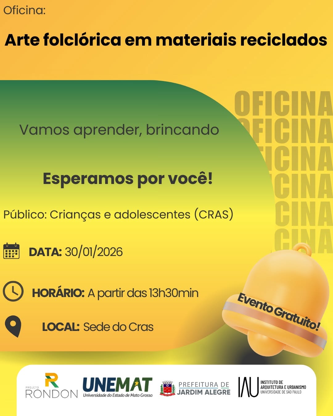 Dando continuidade às ações do Projeto Rondon no município, a Prefeitura de Jardim Alegre informa o cronograma de oficinas desta sexta-feira (30/01), com atividades gratuitas voltadas à tecnologia, educação, cidadania, empreendedorismo, cultura e meio ambiente.