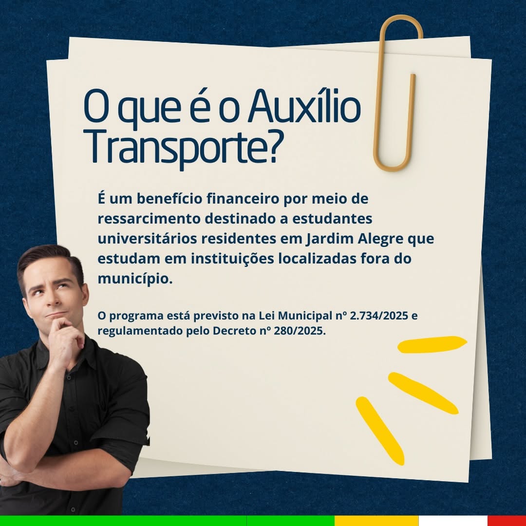 A Prefeitura de Jardim Alegre informa que estão abertas as inscrições para o Auxílio Transporte Universitário 2026.