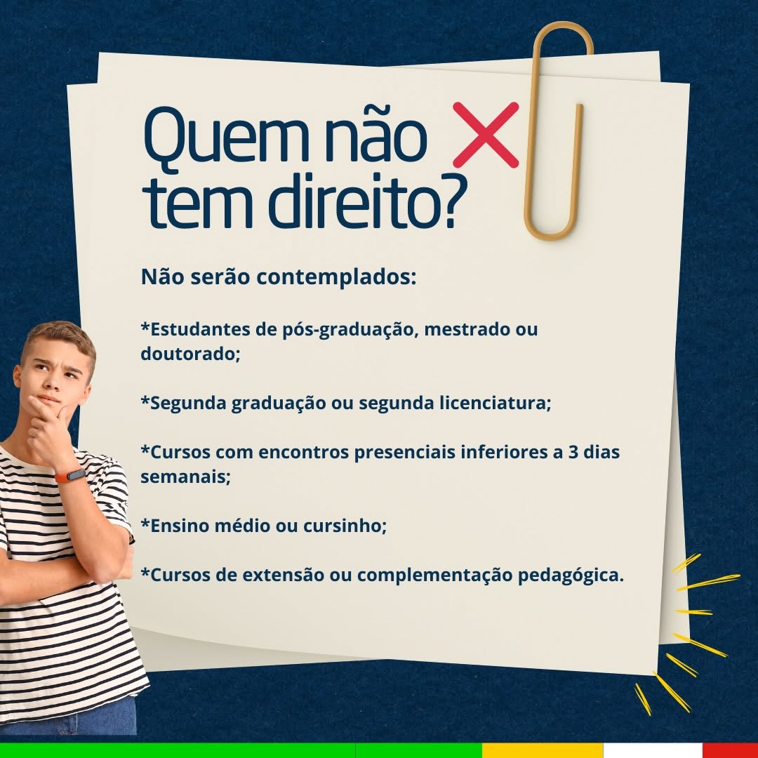 Não têm direito ao benefício estudantes de pós-graduação, segunda graduação, cursos com menos de 3 dias presenciais por semana, ensino médio, cursinho ou cursos de extensão.