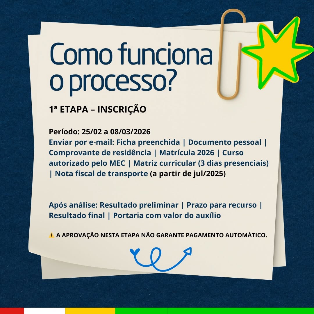 O benefício é destinado a estudantes residentes no município que estejam regularmente matriculados no 1º semestre de 2026, cursando Graduação ou Educação Profissional Tecnológica fora de Jardim Alegre e que utilizem transporte coletivo regular com emissão de nota fiscal.