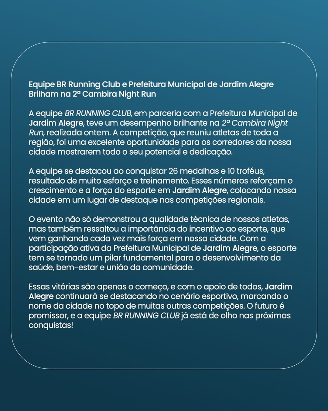 A Equipe BR RUNNING CLUB, em parceria com a Prefeitura Municipal de Jardim Alegre, conquistou 26 medalhas e 10 troféus no evento de ontem!