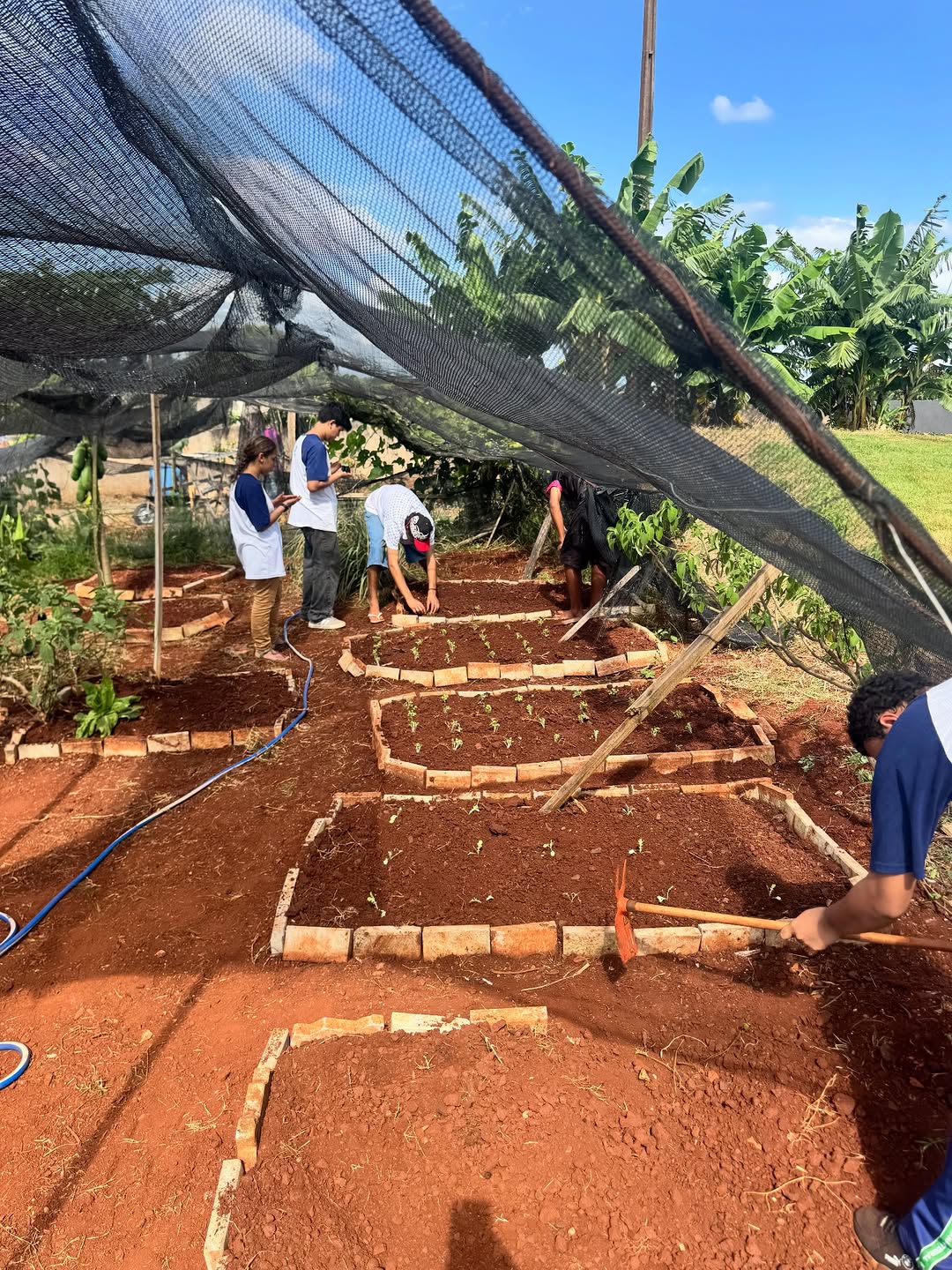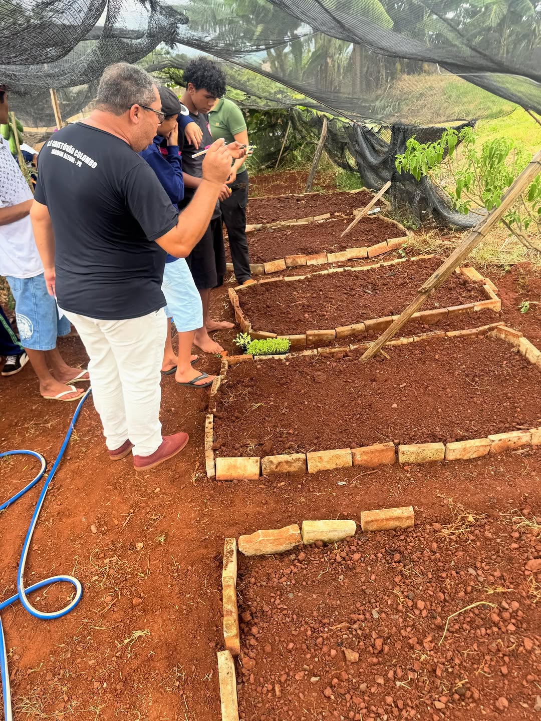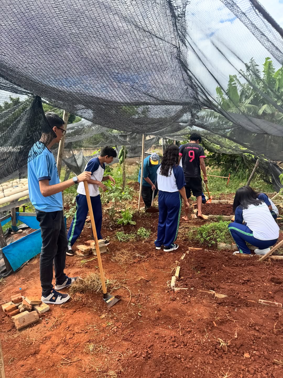 Durante a atividade, os alunos do Ensino Médio e do EJA participaram ativamente do processo, aprendendo na prática sobre o preparo do solo e construção dos canteiros, etapa essencial para o desenvolvimento da horta.