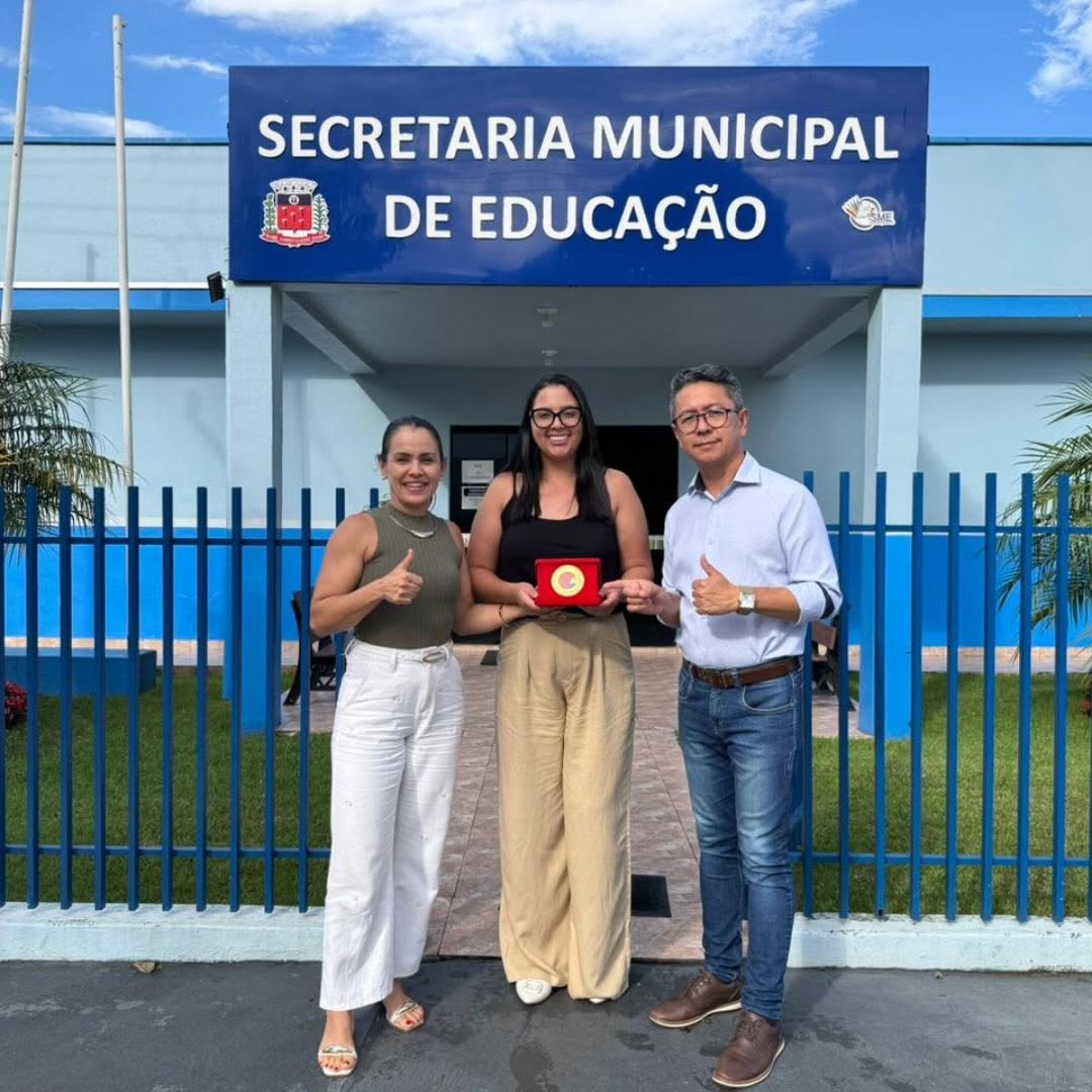 Representando o município, estiveram presentes a Diretora do Departamento Municipal de Educação, Jaqueline Schroeder Barbosa, a Secretária Municipal de Educação, Pamela Andressa dos Santos Dutra, e a Controladora Interna, Luciana Alves Ferreira Fernandes, que receberam a honraria em nome de toda a rede.
