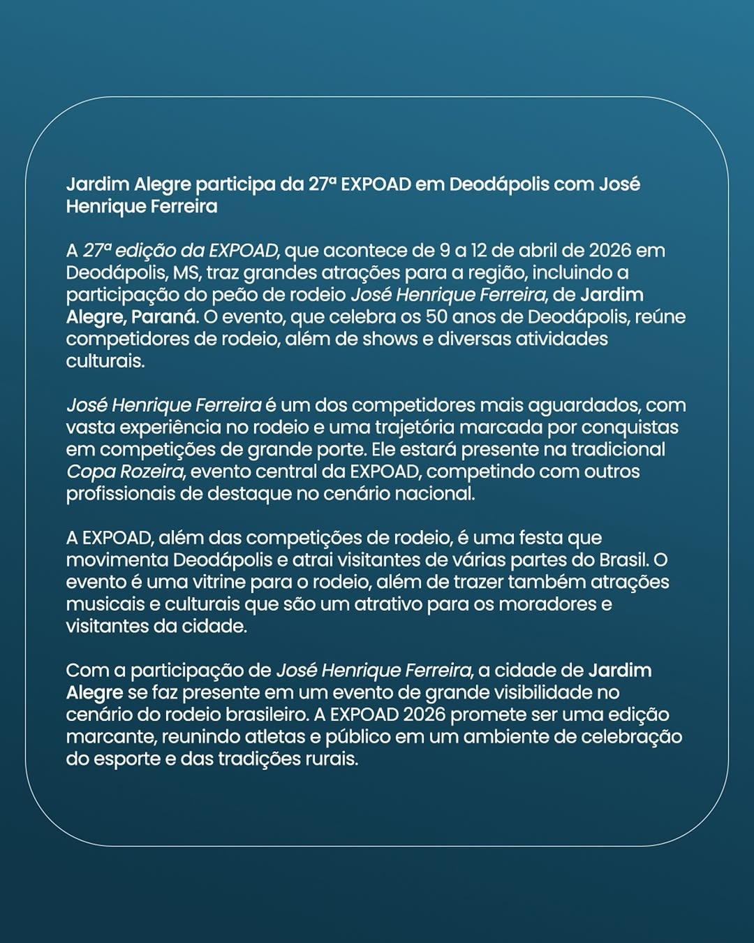 José Henrique Ferreira, está pronto para brilhar na 27ª EXPOAD em Deodápolis! De 9 a 12 de abril, ele vai disputar a tradicional Copa Rozeira e representar com muito orgulho as tradições do rodeio.