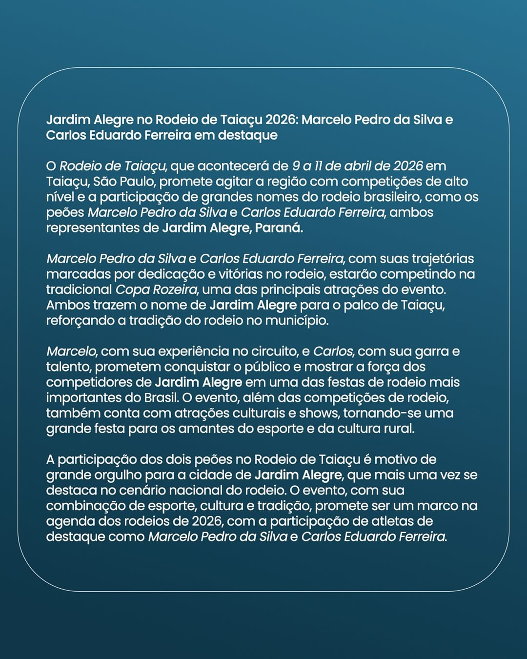 Jardim Alegre está com tudo no Rodeio de Taiaçu 2026! Marcelo Pedro da Silva e Carlos Eduardo Ferreira vão representar nossa cidade com muito talento e força na Copa Rozeira. De 9 a 11 de abril, eles mostram o poder do rodeio de Jardim Alegre!