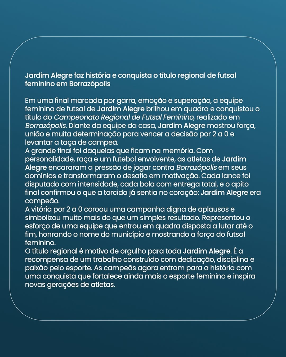 Uma vitória que enche Jardim Alegre de orgulho e valoriza ainda mais a força do esporte feminino. Parabéns às atletas, comissão técnica e a todos que fizeram parte dessa conquista inesquecível.
