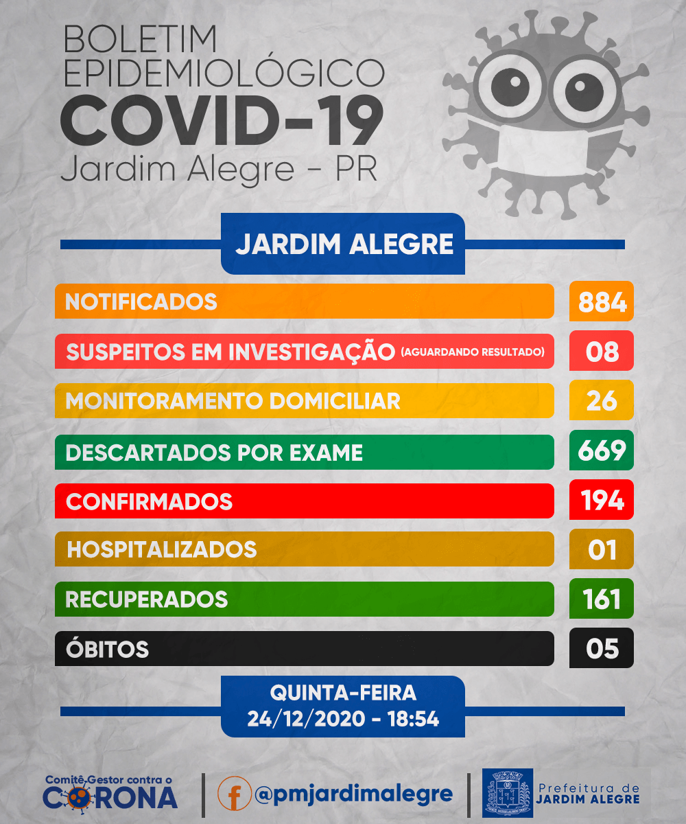 A Secretaria Municipal de Saúde de Jardim Alegre confirma mais 05 casos de Covid-19 no município. Trata-se de 02 homens de 20, 54 e 03 mulheres de 19, 25 e 56 anos de idade. Os exames foram liberados pelo laboratório Lacen. Encontram-se em isolame...